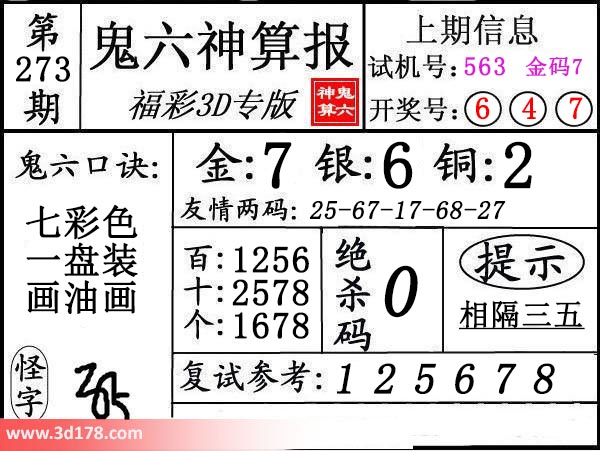 3d第20273期鬼六神算报为您推荐鬼六口诀: