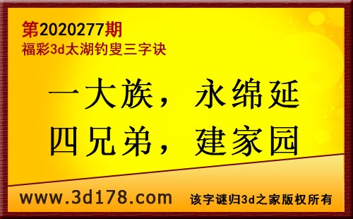 3d第20277期太湖字谜:一大族,永绵延,四兄弟,建家园