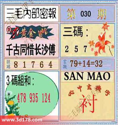 福彩3d第2014030期三毛内部密报图: