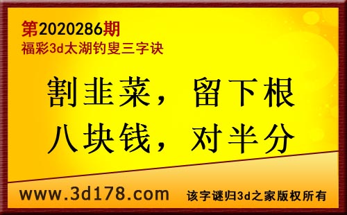 3d第20286期太湖字谜:割韭菜,留下根,八块钱,对半分