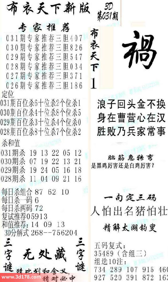 福彩3d第2014031期布衣天下新版: