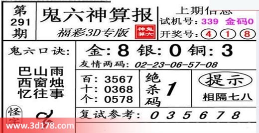 3d第20291期鬼六神算报为您推荐鬼六口诀: