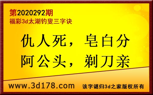 3d第2020292期太湖字谜:仇人死,皂白分,阿公头,剃刀亲