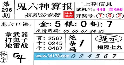 3d第20296期鬼六神算报为您推荐鬼六口诀: