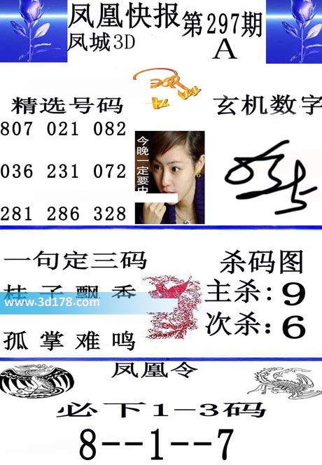 福彩3d凤凰快报图第20297期精选号码推荐:
