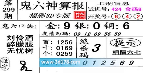 3d第20299期鬼六神算报为您推荐鬼六口诀: