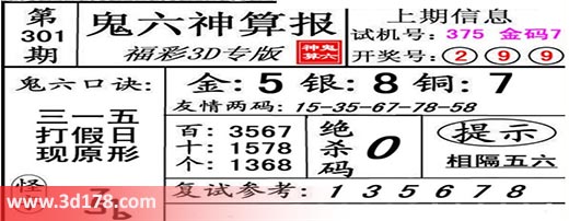 3d第20301期鬼六神算报为您推荐鬼六口诀: