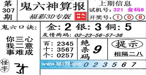 3d第20307期鬼六神算报为您推荐鬼六口诀: