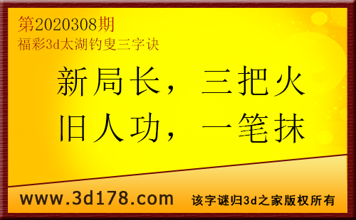 3d第2020308期太湖字谜:新局长,三把火,旧人功,一笔抹