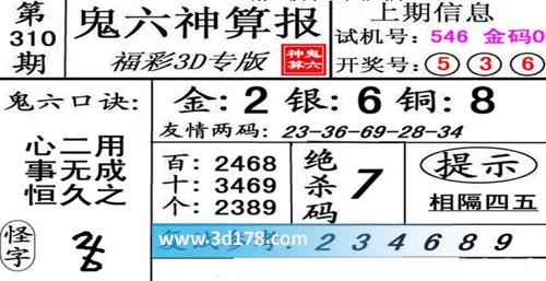 3d第20310期鬼六神算报为您推荐鬼六口诀: