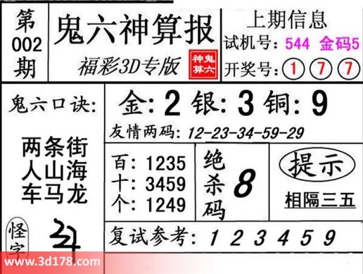 3d第21002期鬼六神算报为您推荐鬼六口诀: