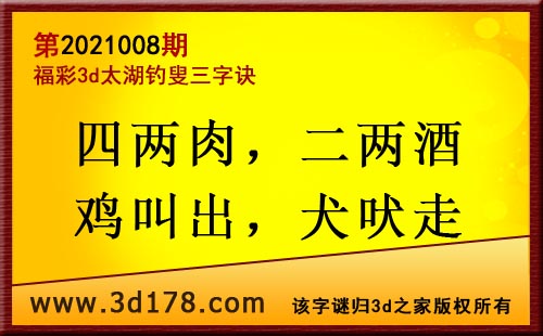 3d第21008期太湖字谜:四两肉,二两酒,鸡叫出,犬吠走