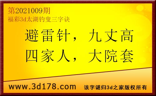3d第21009期太湖字谜:避雷针,九丈高,四家人,大院套
