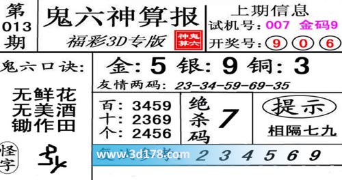 3d第21013期鬼六神算报为您推荐鬼六口诀: