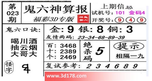 3d第21023期鬼六神算报为您推荐鬼六口诀: