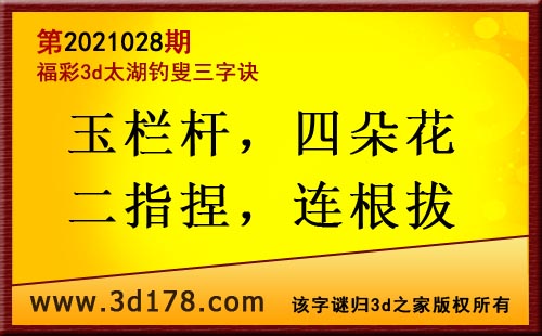 3d第21028期太湖字谜:玉栏杆,四朵花,二指捏,连根拔