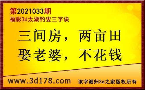3d第21033期太湖字谜:三间房,两亩田,娶老婆,不花钱