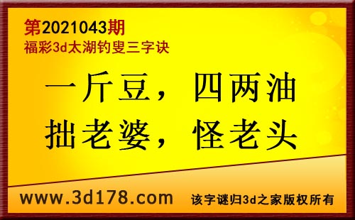 3d第21043期太湖字谜:一斤豆,四两油,拙老婆,怪老头
