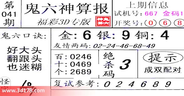 福彩3d之家第2014041期鬼六神算报: