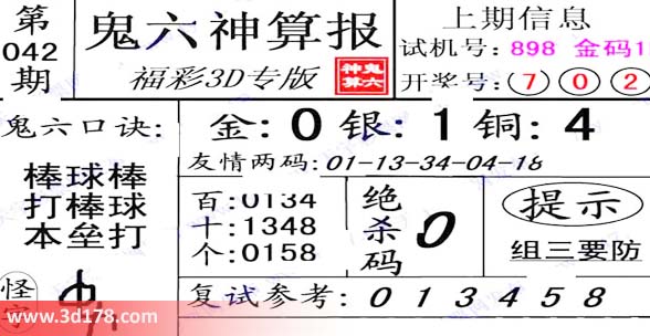 福彩3d之家第2014042期鬼六神算报: