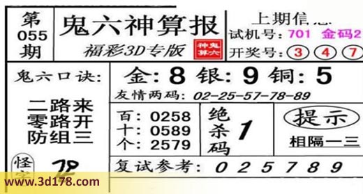 3d第21055期鬼六神算报为您推荐鬼六口诀: