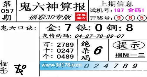 3d第21057期鬼六神算报为您推荐鬼六口诀: