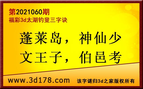 3d第21060期太湖字谜:蓬莱岛,神仙少,文王子,伯邑考