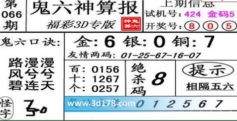 3d第21066期鬼六神算报为您推荐鬼六口诀: