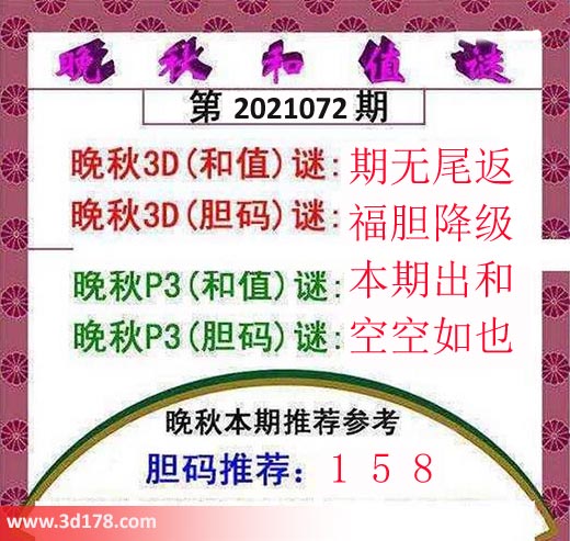 晚秋3D(和值)谜:期无尾返