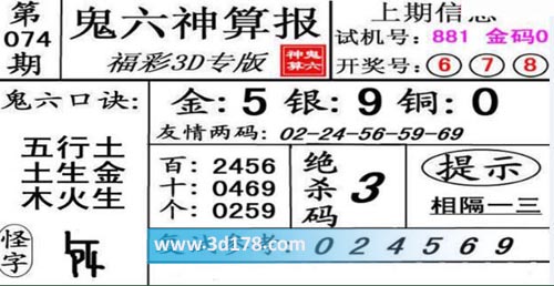 3d第21074期鬼六神算报为您推荐鬼六口诀: