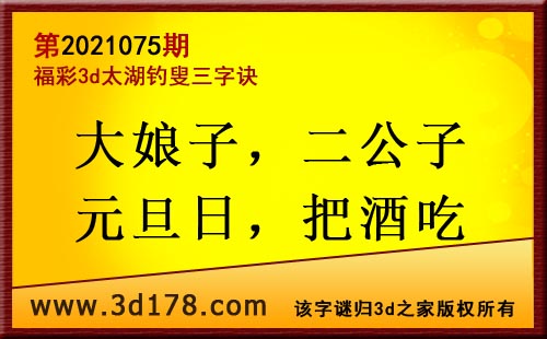 3d第21075期太湖字谜:大娘子,二公子,元旦日,把酒吃