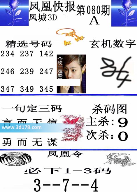 福彩3d凤凰快报图第21080期精选号码推荐: