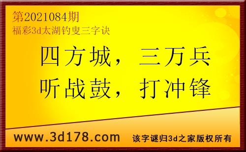 3d第21084期太湖字谜:四方城,三万兵,听战鼓,打冲锋
