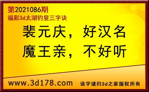 3d第21086期太湖字谜:裴元庆,好汉名,魔王亲,不好听
