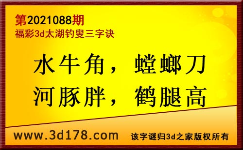 3d第21088期太湖字谜:水牛角,螳螂刀,河豚胖,鹤腿高