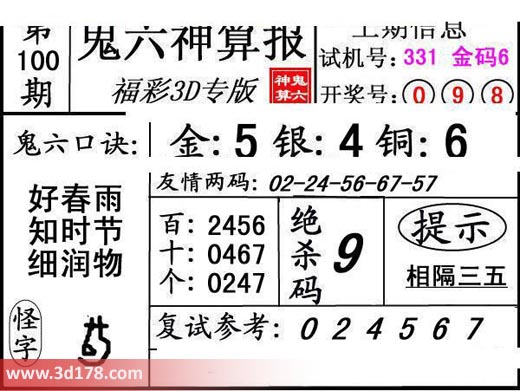 3d第21100期鬼六神算报为您推荐鬼六口诀: