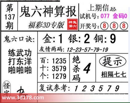 3d第21137期鬼六神算报为您推荐鬼六口诀: