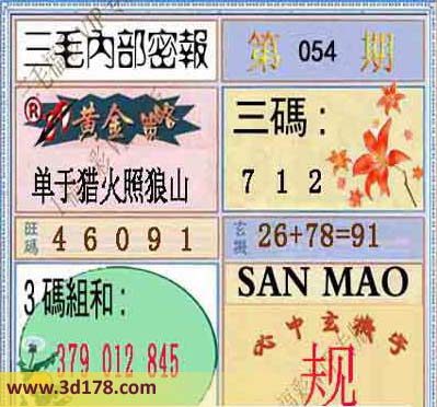 福彩3d第2014054期三毛内部密报图: