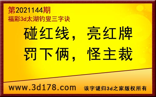 3d第21144期太湖字谜:碰红线,亮红牌,罚下俩,怪主裁