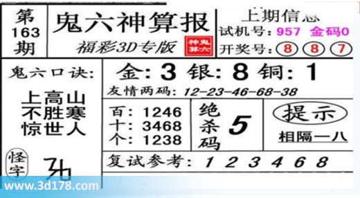 3d第21163期鬼六神算报为您推荐鬼六口诀:
