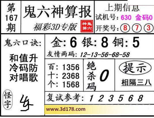 3d第21167期鬼六神算报为您推荐鬼六口诀: