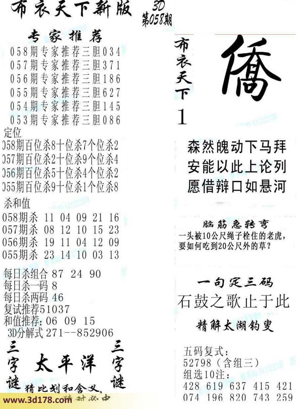 福彩3d第2014058期布衣天下新版详解: