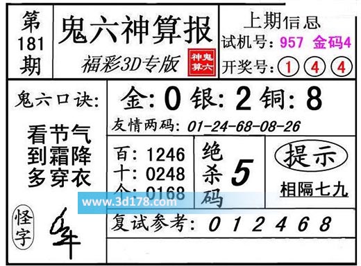 3d第21181期鬼六神算报为您推荐鬼六口诀:
