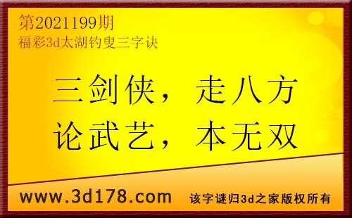 3d第2021199期太湖字谜:三剑侠,走八方,论武艺,本无双