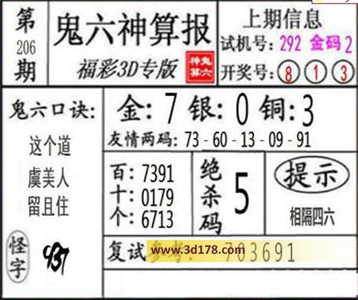 3d第2021206期鬼六神算报为您推荐鬼六口诀: