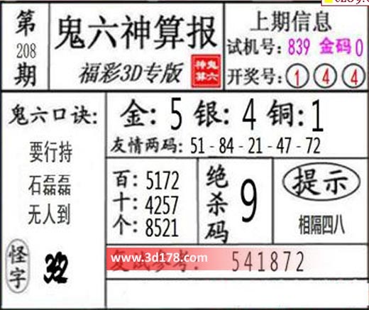 3d第2021208期鬼六神算报为您推荐鬼六口诀:
