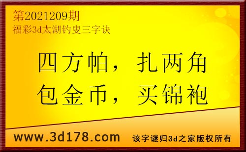 3d第2021209期太湖字谜:四方帕,扎两角,包金币,买锦袍