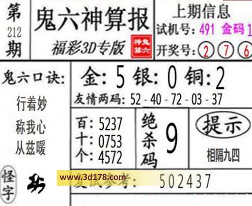 3d第2021212期鬼六神算报为您推荐鬼六口诀: