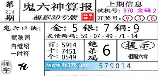 3d第2021214期鬼六神算报为您推荐鬼六口诀: