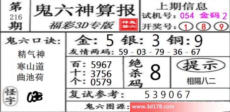 3d第21216期鬼六神算报为您推荐鬼六口诀: